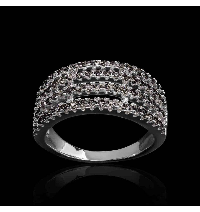 Bague diamant noir Mylène en or blanc palladié 18K (7.5 g), or jaune 18K (6g) or rose 18K (6 g) ou platine (9g). Largeur 8,94 mm. Pavage diamants noir (0,41 carat)