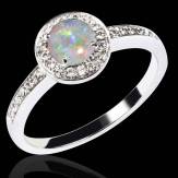 Bague opale blanche ovale en or blanc palladié 18K (4.15 g), or jaune 18K (3.5 g), or rose 18K (3.5 g) ou platine (6 g). Pavage diamants 0.15 carat, opale blanche 1 carat, 1,5 carats ou 2 carats