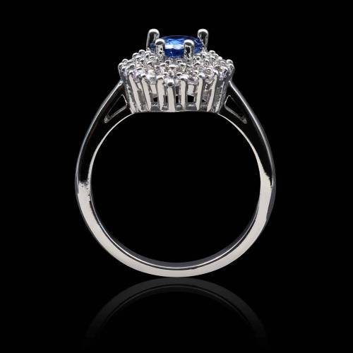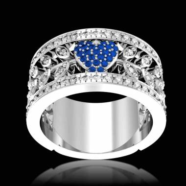 Bague diamant en or 18 k (14 g), coeur pavé de saphirs bleus (24 pierres) et pavage diamant (0,76 carat), rubis, émeraude, saphir bleu ou saphir rose.