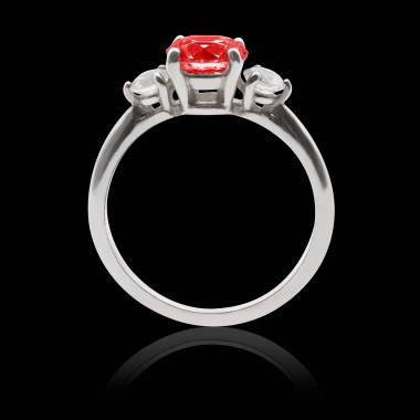 Bague trilogie or blanc palladié 18k (2,2 gr), or jaune 18K (2,1 gr), or rose (2,1 gr) et platine (3 gr). Pierre centrale spinelle rouge et 2 diamants de 0.10 carat chaque côté.