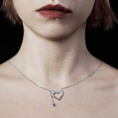 Pendentif saphir bleu en or blanc palladié 18K, or jaune 18K ou or rose 18K. Diamant de 0.10 carat et pavage diamants, ou rubis, ou émeraude ou diamant noir ou saphir. Chaîne forçat limée de 40 cm en or 18K