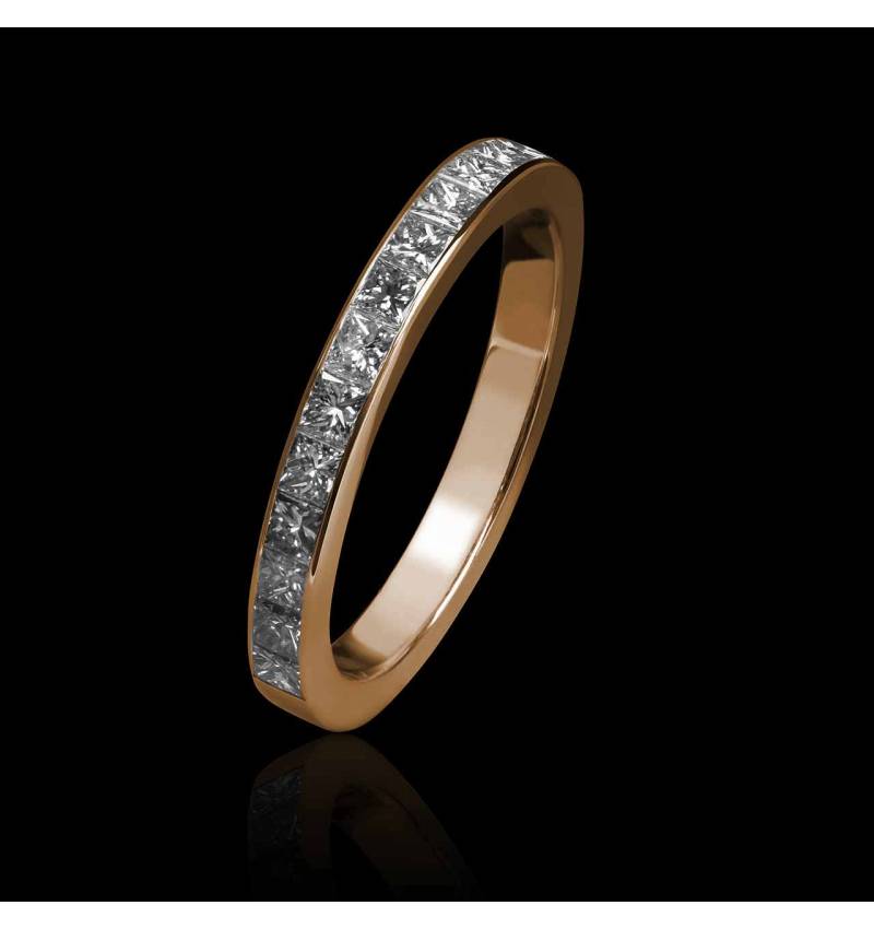 Alliance en or rose 18K (2.6 gr), pavage diamants forme carré princesse 0.35 carat, diamant noir 0.35 carat, émeraude 0.28 carat, rubis 0.40 carat et saphir 0.40 carat