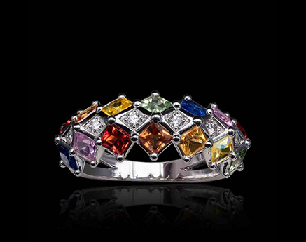 Cette création provoque une spirale de couleurs vraiment unique : depuis le magnifique vert du péridot jusqu’au blanc pur du diamant en passant par la beauté du saphir bleu et la clarté de l’aigue marine.